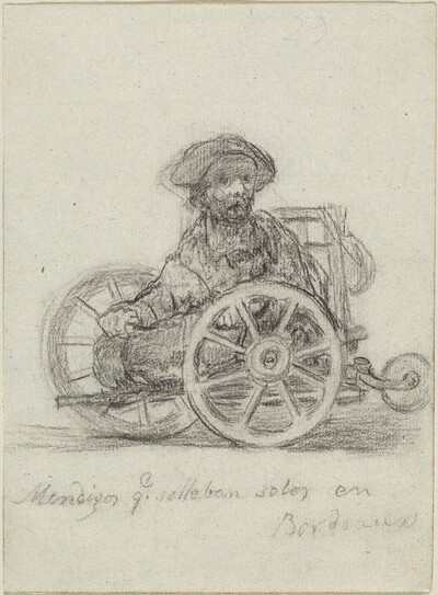 Un mendigo se inclina ligeramente, apoyado sobre una muleta, mientras adelanta el sombrero en ademán de pedir limosna. El ligero trazo del lápiz hace extrañar el vigor y la energía con que Goya estaba empleado en los dibujos de sus Cuadernos de Burdeos (ca. 1824-1828), en los que aparecen tipos marginales, enfermos y vagabundos que el aragonés observó en las calles francesas. Es el caso de Mendigos que se lleban solos en Bordeaux. Sin embargo, el tratamiento de esos personajes resulta mucho más expresivo que en este dibujo, aunque sin caer en la caricatura.