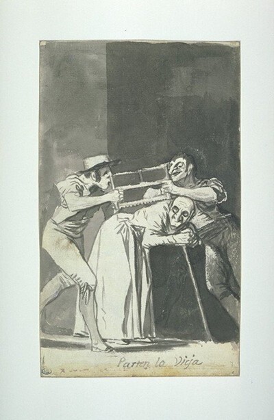 Una vieja está tumbada sobre un banco de carpintero, del que vemos los cajones en primer término. Un musculoso carpintero la sierra por la mitad. Al fondo, observan la escena dos personajes que ríen maliciosamente y que, según Gassier, serían sacerdotes. A simple vista, la escena parece seguir un esquema habitual en Goya a la hora de representar escenas de tortura y violencia, con tres personajes (verdugo-víctima-espectador o espectadores), muy próximos en la composición. Sin embargo, Goya recoge una representación simbólica de la mitad de Cuaresma, tal y como explica la leyenda. Partir la Vieja era el nombre dado a una festividad popular, tradicional en Andalucía, que se celebraba el domingo central de la Cuaresma, y que servía para hacer una pausa de las restricciones impuestas en este periodo. El calendario litúrgico intercalaba fiestas populares, en muchos casos de remoto origen pagano, que podían incluir representaciones burlescas como ésta, que para Gassier remitiría, más concretamente, a los carnavales gaditanos. Otro dibujo anterior, Parten la vieja, con el mismo tema pero diferente puesta en escena, forma parte del Cuaderno B. Para Ilatovskaya, este dibujo ejemplifica la habilidad de Goya para reunir, de un lado, una representación vívida y directa de una escena que Goya ha representado como si la hubiera contemplado; y, de otro lado, la capacidad de dotarla de una lectura simbólica universal, crítica tanto con el celo de la Iglesia Católica como con la relajación de costumbres del género humano. Una intención global que sería común a todos los dibujos de Burdeos.