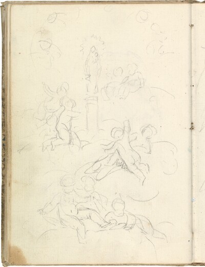 Tanto el dibujo preparatorio como la obra definitiva presentan una composición algo más compleja que la de otro cuadro votivo de idéntico tamaño que Goya pintó por aquellas mismas fechas, Virgen del Pilar, cuyo apunte preparatorio se encuentra, precisamente, en la página contigua del Cuaderno italiano (p. 134). De hecho, ambas pinturas las concibió Goya como pareja, probablemente como un regalo para sus padres a su regreso de Italia, permaneciendo en poder de los Lucientes, rama materna de la familia del pintor, hasta 1926, en que Francisca Lucientes, descendiente del pintor, las vendió a la Real Academia de Bellas Artes de San Luis de Zaragoza, que las tiene depositadas en el Museo de Zaragoza.