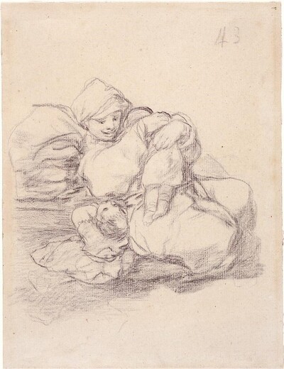 Entre la variopinta selección de temas tratados por Goya en los cuadernos de Burdeos, Ilatovskaya cree identificar una serie de escenas de aire más sentimental, de evocadora domesticidad, en acusado contraste con otras escenas protagonizadas por prisioneros, locos o peleas. Así, Mujer con dos niños (H.43) o Mujer joven con un niño en brazos (H.49) muestran intimistas escenas de maternidad, mientras que El cántaro roto (H.1) tiene un tono más bucólico. Este dibujo representa un episodio de espíritu similar, en el que dos figuras aparecen en un interior, quizá un dormitorio en el que una de ellas ejerce de cuidadora del segundo personaje, identificado por Gassier como otra mujer de avanzada edad. Ésta última, queda en penumbra y bebe de un tazón que sujeta con ambas manos, ofrecido por su enfermera en un platillo. Goya sombrea delicadamente las zonas en torno a las manos y platos para hacer hincapié en este preciso y universal gesto de ayuda. Apenas vemos el rostro de perfil de esta buena samaritana, que lleva el pelo recogido en un pañuelo anudado y ocupa la parte central del papel. Es una auténtica mancha de luz en medio de la escena, donde el juego de volúmenes tiene un papel más importante que el dibujo de los contornos a la hora de crear la composición. El entorno aparece apenas insinuado con unos drapeados al fondo, que podrían corresponder al lecho del que se ha incorporado la persona convaleciente. Ya sea inspirado en una visión directa o como recuerdo reelaborado del pasado, el tema central del dibujo parece simplemente el de los cuidados inspirados por la caridad y la compasión.