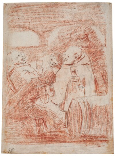 En una bodega cuatro frailes beben opulentamente ante un barril de vino. Tres de ellos, que aparecen claramente iluminados, se encuentran de cara al espectador, mientras que otro en primer término está de espaldas y sostiene en una de sus manos un vaso de grandes dimensiones. En el fondo se distingue una figura fantasmagórica que cubre su cabeza con una capucha y que presencia complacida esta escena.