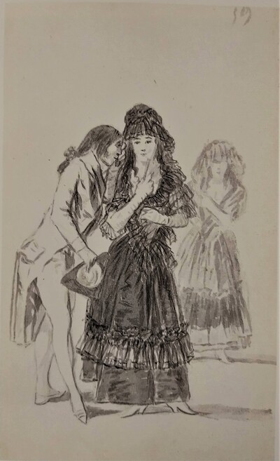 Esta estampa fue precedida por dos dibujos preparatorios que se conservan en el Museo Nacional del Prado. El primero es una aguada en tinta china que pertenece al Álbum B y el segundo es una aguada en tinta china.