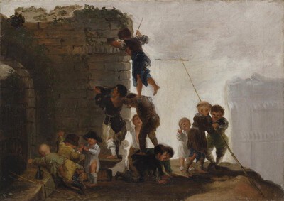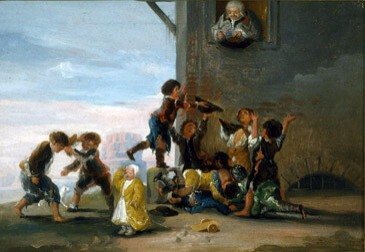 Las pinceladas rápidas y gruesas con que capta la indumentaria de los muchachos contrastan con los golpes de pincel más ligeros dados a los edificios del fondo. Goya ha pintado el paisaje recurriendo a tonalidades frías que sugieren ligereza frente a las oscuras siluetas de los niños.
