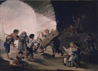 Un grupo de siete niños "juega a pídola", antiguo juego que consiste en que un muchacho salta por encima de otro que se encorva. La escena se sitúa al aire libre, delante de un fondo de sábanas extendidas y de arquitecturas que Goya ha pintado detrás de éstas. El aragonés ha recreado diversas posturas habituales en la práctica de este juego, desde la posición erguida previa al salto, la postura encorvada de quien ha de ser saltado así como la caída. Es posible que el pintor haya encontrado una fuente de inspiración para este cuadro en la obra Niños jugando al filderecho (ca. 1725, Palacio de la Granja, Patrimonio Nacional, Segovia) que Michel-Ange Houasse (París, 1680- Arpajon, 1730) ejecutó durante su estancia en España.