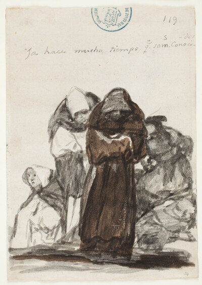 La leyenda principal del dibujo, dado que se leía mal por la aguada, fue duplicada por Goya en el reverso del dibujo precedente, titulado Ya hace mucho tiempo que somos conocidos (C.119).