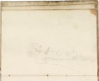 Este dibujo del Cuaderno italiano muestra un paisaje muy ligeramente apuntado a lápiz negro, desplegado en sentido transversal a la página. Presenta un cauce de río que es atravesado por un puente de pontones y que recorre en diagonal la composición, que se completa con algunas edificaciones y árboles. Dicha composición está planteada de un modo similar a la vista incluida en la página 76 del mismo cuaderno, que muestra los alrededores del puente de Segovia, en Madrid. Manuela B. Mena llegó a apuntar en 1994 que podría tratarse de otra zona de la ciudad distinta al entorno del río Manzanares o incluso de otra población, aunque posteriormente se ha interpretado como una vista de la orilla derecha del citado río a su paso por Madrid, con la Iglesia de San Francisco el Grande al fondo.