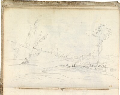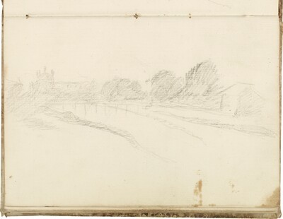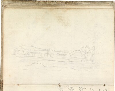 Somero paisaje a lápiz negro contenido en la página 131 del Cuaderno italiano, que resulta muy similar al dibujo de la página del mismo inmediatamente precedente. Se observa un río y un puente que parece de pontones; varios arbolillos en la orilla y, a la izquierda de la composición, una edificación de buen tamaño. Los trazos son muy ligeros, constituyendo apenas un apunte, probablemente del natural. Manuela B. Mena apuntó en 1994 la posibilidad de que se tratara de un paisaje zaragozano o de su entorno, a diferencia del resto de los apuntes de paisaje incluidos en el Cuaderno italiano, que parecen corresponder a vistas urbanas de Madrid. No obstante, posteriormente se inclinó por considerarlo una vista de Madrid en el entorno del río Manzanares, pareciéndole una visión del mismo puente de la página 130 del cuaderno, pero desde un punto de vista más próximo. De hecho, este y otros apuntes similares del Cuaderno italiano (pp. 72, 74, 76, 94-95, 109 y 130) se han identificado como vistas de Madrid y se han relacionado con los fondos de los cartones para tapices que Goya realizó a partir de 1775 por encargo de la Real Fábrica de Tapices de Santa Bárbara de Madrid.