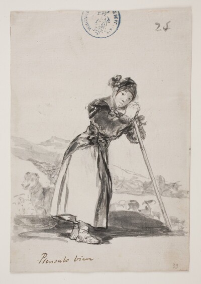 Pastora pensativa es un dibujo escasamente estudiado, aunque Gassier lo ha comparado con Piénsalo bien (C.25), en el que una pastora pensativa se apoyaba sobre su vara. En aquel Cuaderno C se encuentran otras escenas de ambientación bucólica, como La huevera (C.12), donde también aparece una figura femenina similar a esta. Goya parece retomar en el Cuaderno H algunas de estas escenas de ambiente campestre, cercanas al costumbrismo popular que recuerdan el trabajo de Goya en los cartones para tapices. La comparación entre ambos dibujos evidencia la evolución del artista a la hora de abordar el mismo tema. En el dibujo más antiguo, que era una aguada, la muchacha está representada a menor escala y la ambientación era más propiamente campestre, pues el paisaje montañoso estaba distribuido en vario planos, dando profundidad a la escena. Aquí, en cambio, el entorno se intuye más que se observa y se hace hincapié en la representación de la vestimenta de la pastora, con trazos enérgicos y un suave sombreado en el rostro.