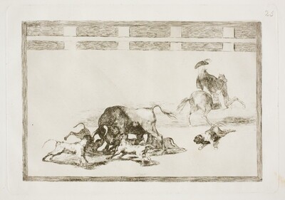Dibujo preparatorio de la estampa Perros al toro (Tauromaquia C). La escena representa el momento en que le echan los perros a un toro manso. En este caso la composición es abigarrada y movida, aparecen muchos personajes en la misma y da sensación de agitación, de mucha actividad. Tiene lugar en el ruedo de una plaza de toros, de la que se esbozan al fondo la barrera, los tendidos y el público.
