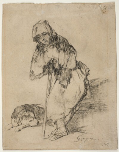 En el dibujo, de tema campestre, vemos a una joven muchacha de pie, apoyada en una vara, que parece una pastora. Dentro del Cuaderno C encontramos otras escenas campestres protagonizadas por muchachas campesinas relacionables con esta. Es el caso de Esta pobre aprovecha el tiempo (C.11) y de La huevera (C.12). Hay un dibujo en el Cuaderno H o Cuaderno de Burdeos II, titulado Pastora pensativa, que tiene prácticamente la misma composición que este. Aquí el paisaje es más completo y se ven las colinas lejanas y el bosque ante el cual se sitúa la figura. Esta se encuentra sobre un montículo marcado con una sombra espesa, su perro detrás de ella y en segundo plano, esbozadas rápidamente, las cabezas de su rebaño.