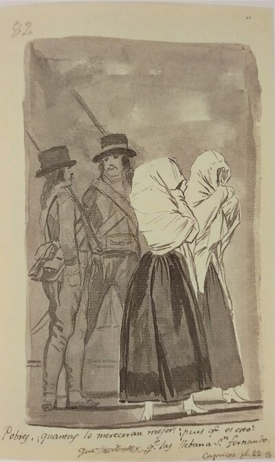 El boceto que aquí nos ocupa sirvió de preparación para el Capricho 22, ¡Pobrecitas!. Además se observa clara dependencia respecto al dibujo 82: Pobres, ¡quántas la merecerán mejor! ¿Pues qué es esto? Qué ha de ser, que las llevan a San Fernando del Cuaderno B.