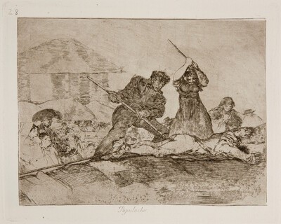 El dibujo preparatorio para el grabado Populacho es un trabajo preciso y minucioso en el que Goya tiene claras las posturas de los dos personajes en primer término que apalean un hombre o a un cadáver, puesto que las mantendrá en la estampa. También mantendrá en el grabado a los espectadores que asisten a la macabra escena. Asimismo bosqueja con delicadeza pero con detallismo el cuerpo, quizá un cadáver, que está siendo brutalmente sacudido, concibiéndolo del mismo modo que en el resultado final.