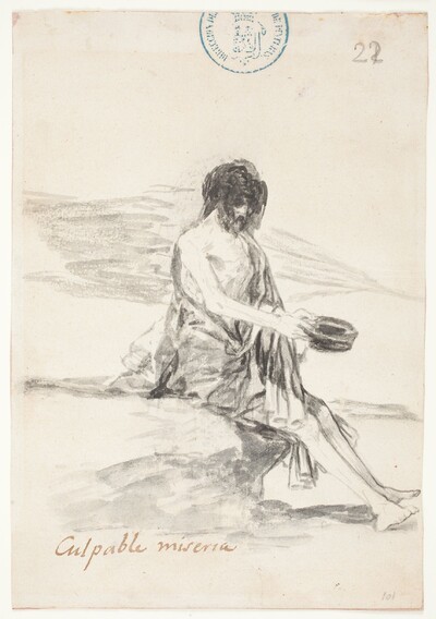 Sencillo dibujo de fondo neutro en el que vemos a una figura en el centro del papel. Se trata de un hombre gordo sentado en un sillón bajo y con las piernas muy abiertas. Está visto de frente bajo una luz que lo ilumina completamente remarcando su obesidad. A Goya solo le inspira piedad, de ahí la simple leyenda que acompaña al dibujo. Cabe destacar que en el suelo se proyecta una sombra mayor que la habitual en otros dibujos del Cuaderno C, pues corresponde a la oronda silueta del personaje.