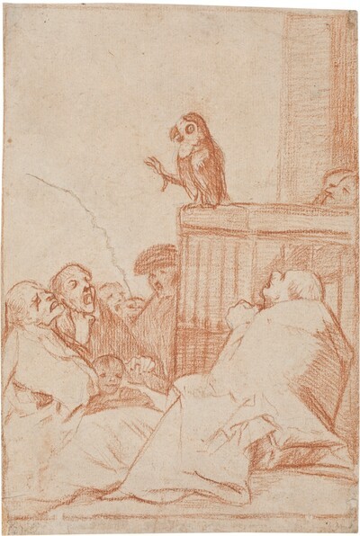 Sobre un púlpito se apoya un loro que pronuncia un sermón con una pata extendida. La audiencia, compuesta por viejos monjes, permanece extasiada. Todos tienen la boca abierta, excepto uno que porta bonete y que se encuentra junto al púlpito, bajo el animal. Éste mira con un gesto de desagrado, parece no hacer caso a la palabrería del embaucador.