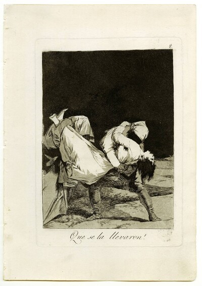 Este es el dibujo preparatorio para el Capricho nº 8, Qué se la llevaron que, a su vez, se inspira en el dibujo nº 61 del Cuaderno B, Caricaturas. Es día de su Santo.