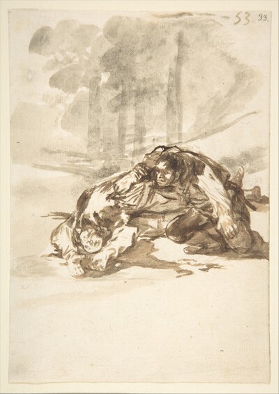 Gassier, que no pudo acceder al dibujo original, creyó ver aquí unas figuras femeninas, en una interpretación romántica del origen del drama que se ha descartado totalmente. El tema de la pelea entre dos personajes aparece recurrentemente en la obra de Goya, como en la pintura Duelo a garrotazos. El conjunto más abundante de escenas de duelo aparece en el Cuaderno F, con hasta siete escenas de este tipo, en su mayor parte con armas blancas y cierto aire teatral. Es el caso de A puñaladas (F.53). De estos dibujos, el más parecido por su composición e intensidad emocional es Desafíos. Con navajas (F.15), en el que los dos combatientes aparecen enzarzados, casi fundidos y sin posibilidad de retirada. Otras variaciones del tema incluyen una pelea femenina de tono menos dramático, bajo el idéntico título de ¿Quién vencerá? (E.36) en el Cuaderno E.
