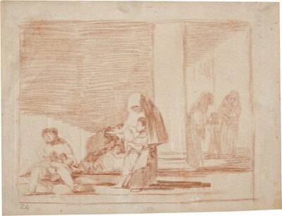 La escena parece estar teniendo lugar bajo una amplia arcuación que cobija a los personajes, posiblemente en la calle. Este tipo de amplios arcos fue empleado por el artista en diversas ocasiones como en Interior de una prisión así como en Niños jugando a los toros, por citar algún ejemplo. También se utiliza esta estructura en los grabados de la serie Los desastres de la guerra nº 11, Ni por esas y nº 13, Amarga presencia.