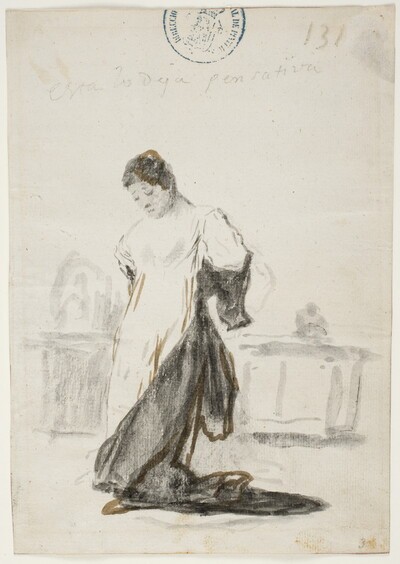 - Aguada de tintas china, parda y parda clara, y leves trazos de lápiz negro sobre papel verjurado
