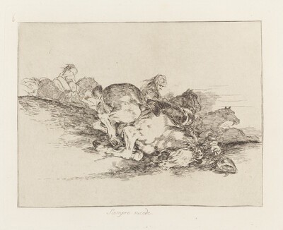 No existen diferencias sustanciales entre el dibujo preparatorio y el grabado, lo que indica que Goya tenía una visión muy clara de la escena cuando pergeñó el papel. Una de las pocas modificaciones del dibujo con respecto al resultado final consiste en que el caballo del fondo se halla más cerca del que se encuentra en el centro de la escena. Además, en el grabado, Goya perfila con un poco más de claridad el resto de los caballos y jinetes.