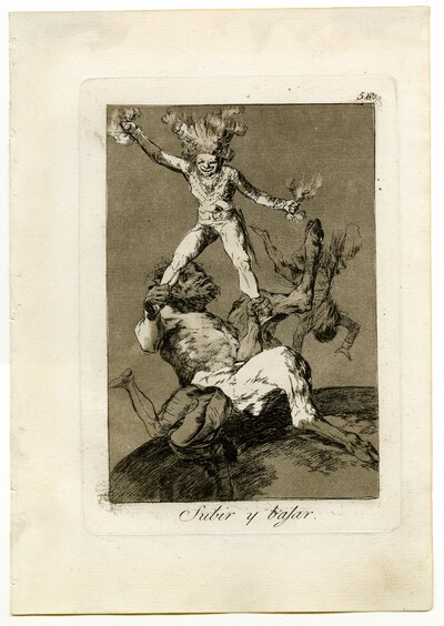 Esta es una de las composiciones más extrañas realizadas por Goya, una especie de Brujo Mayor, con patas de macho cabrío y rostro humano, sostiene en equilibrio entre sus manos a un pequeño personaje cuyos cabellos y manos echan llamas. Otros dos personajes, a un lado y a otro, caen al vacío. El aguafuerte precisará mejor la superficie sobre la cual está sentado este personaje, tratándose de un globo terráqueo.