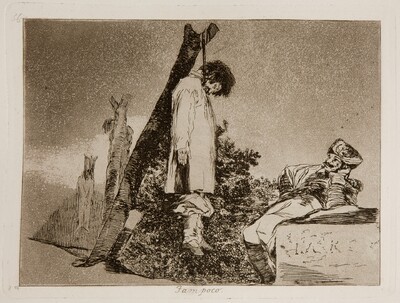 El dibujo forma parte de una serie de ocho escenas del Cuaderno G en los que se representaban crímenes, episodios de violencia y castigos varios, como las dos escenas de Castigo francés que suceden a esta obra. Algunos de estos tienen lugar en una España del pasado, la que Goya había dejado atrás y que evoca episodios terribles que son más abundantes en el Cuaderno H. Es el caso de Muerte de Antón Requena (H.53) o de Maniatado de rodillas (H.21). En este caso, asistimos a lo que Gassier considera el resultado de un ajuste de cuentas entre campesinos o cazadores y lo compara con el dibujo de El pelado de Ybides (F.16). En primer término, uno de los adversarios aparece ahorcado en un árbol, la cabeza colgante y la boca abierta, todos sus miembros pendiendo sin vida. A su derecha, el supuesto vencedor, con un rostro grotesco de ancha nariz, se dispone a marchar cargando en sus espaldas lo que parece un osezno, quizá el motivo de la disputa. La crueldad de la escena se refuerza por la actitud de alegría maliciosa de este cazador, quien se ensaña así con su víctima. En un plano posterior, a la izquierda, se adivina un grupo de una o más personas que contempla este trágico final. La curvatura del árbol se une con la de un montículo al pie de los personajes, enmarcando el tema central de la escena e imprimiendo movimiento y profundidad a la composición. Algunos elementos se han destacado con trazos intensos del lápiz litográfico, como la corteza rugosa del árbol, las vestiduras y la silueta del ahorcado o la piel del oso. El tema del ahorcado es una vuelta a escenas terribles, a veces protagonizadas por una violencia cainita, como las representadas en los Desastres de la guerra, especialmente el Desastre 36. Tampoco. Aunque el contexto de ambas escenas y su planteamiento formal no tienen mucho en común, sí que comparten el terrible contraste entre el horror que produce el crimen frente a la actitud distanciada de un testigo que lo contempla. Ilatovskaya habla del suceso en relación con las circunstancias de la vida en el campo y explica, como un hecho normal en la España rural de la época, que los transeúntes se encontraran a ahorcados en el camino.