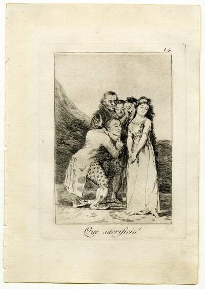 Dibujo preparatorio para el Capricho 14, ¡Que sacrificio! en el que se representa y critica un matrimonio por conveniencia. La estampa reproduce fielmente el dibujo preparatorio, aunque con algunos cambios en detalles del fondo y los rostros.