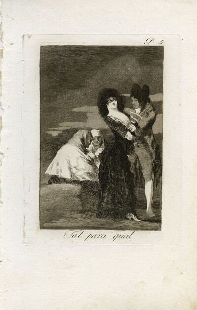 Goya se ha basado en este primer dibujo en el Cuaderno B Majas de paseo a su vez sirve de idea de inicio para el Capricho 5, Tal para cual