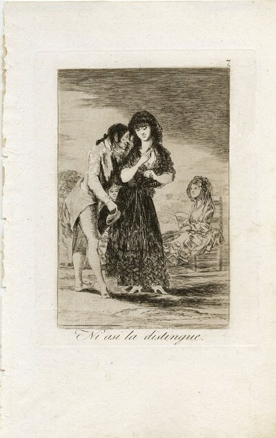 En el fondo del dibujo el pintor aragonés ha pergeñado diversos personajes sentados que miran la escena. Esta idea será posteriormente sustituida por la mujer que observa a la pareja, probablemente una alcahueta, que aparece tanto en el Cuaderno B como en el grabado, y por la cara que Goya ha grabado en el espacio que queda entre la mujer y el hombre, a la altura de la cintura.