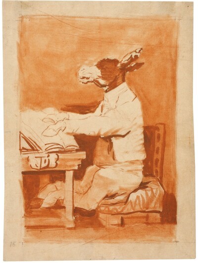 Este dibujo, perteneciente a la serie de los Sueños , es uno de los trabajos previos para el Capricho nº 39, Hasta su Abuelo y, a su vez, se inspira en el dibujo del Cuaderno B, Máscaras de B. También hay máscaras de borricos literatos (B.72) . Se cree que es el número 26 de la serie.