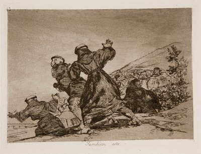Se advierten varias modificaciones en este dibujo preparatorio con respecto al grabado Tambien esto. La más significativa es que en el lado derecho del dibujo se ve una estructura que podría ser una alusión a un edificio, quizá a una iglesia o a un convento, del que los frailes corren despavoridos. En el grabado este elemento ha sido eliminado y en su lugar se ha colocado una montaña. Además en el dibujo los frailes que se hallan en primer término tienen los hábitos levantados, detalle que Goya ha eliminado en la estampa y que podría aportar una nota satírica a la imagen.