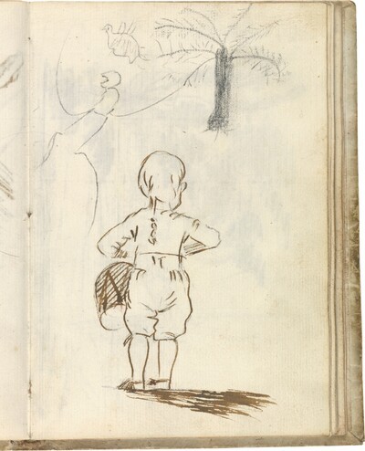 Cabeza masculina de perfil, orientada hacia la izquierda, muy sintética y de rasgos caricaturescos: presenta prominente nariz, labio superior grueso y frente huidiza. Algunos trazos curvos insinúan el cabello. La ejecución es muy esquemática, pues se trata de un esbozo apenas desarrollado realizado a lápiz negro con una factura que a juicio de Manuela B. Mena sería emparentable con la de otros dibujos del Cuaderno italiano difícilmente atribuibles a Goya y más propios de un niño (pp. 100, 101, 106, 107, 108, 117, 118, 119, 129, 133 y 148, por completo, y pp. 71 y 79, parcialmente), dibujos que situó en la órbita creativa del pequeño Javier Goya (1784-1854), hijo del pintor. La ubicación concreta del dibujo dentro del Cuaderno italiano, entre tres de los citados dibujos infantiles y cuatro páginas en blanco, reforzaría la hipótesis de la autoría por parte del pequeño Javier Goya. No obstante, este dibujo denota una destreza aparentemente algo mayor que la de otros dibujos infantiles presentes en el taccuino goyesco.