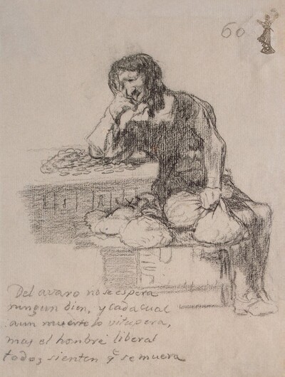 El significado de la escena, claramente moralista, parece evidente. Ilatovskaya lo pone en relación con la preocupación de Goya por representar la avaricia a través de personajes que acumulan riquezas. Gassier señala otras tres representaciones del tema en los cuadernos de dibujos de Goya: Largueza contra avaricia (B.76), Estropeada codiciosa (¿D.k?) y Del avaro no se espera ningún bien (G.60), así como en el Capricho 30. Porque esconderlos? (enlazar).