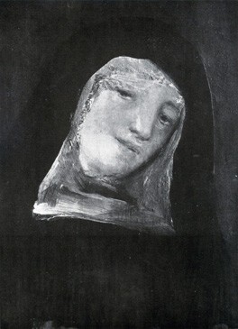 Rostro de fraile con barba blanca que inclina su mirada cabizbajo, como si estuviera inmerso en sus pensamientos sobre un fondo gris-rojizo.