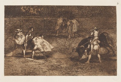 Dibujo preparatorio de la estampa Varilarguero a hombros de un chulo, picando a un toro (Tauromaquia D). Vemos como un picador o torero, a hombros de otro torero o de un chulo, le clava una pica al toro que tiene delante, que entra al capote que sujeta el otro personaje. Lafuente Ferrari se muestra convencido de que la escena la protagonizó en la plaza de Madrid Juan Jorge, llamado Joaquinín, hacia 1776.