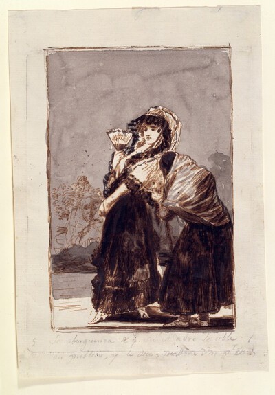 Es la idea inicial que dará lugar al Sueño 20 (Se avergüenza de que su madre le hable en público y le dice: perdone v.m. por Dios) y al Capricho 16 (Dios la perdone. Y era su madre). Son pocas las variaciones que el grabado presenta con respecto al dibujo, en el que utiliza una aguada gris algo transparente y tinta negra sin diluir para captar el tejido con que está hecho el vestido de la maja.