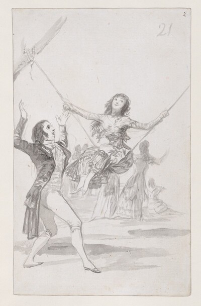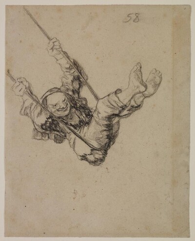 Goya se había ocupado años atrás del tema del columpio en varias obras: en un cartón para tapiz titulado El columpio (1779), en uno de los lienzos que realizó para decorar la Alameda de los Osuna, denominado también El columpio (1786-1787), y en un dibujo titulado a su vez El columpio (B.21) (ca. 1794-1797), si bien conforme a un ambiente galante bien diferente al del presente dibujo. Algo más cercano en concepto resulta el dibujo preparatorio de un capricho que no llegó a grabar, titulado Columpio de brujas (ca. 1797). Sin embargo, la obra más próxima a la que nos ocupa, desde el punto de vista temático y conceptual, es una estampa que Goya grabó al aguafuerte y aguatinta, también en Burdeos: Viejo columpiándose (1826-1828).