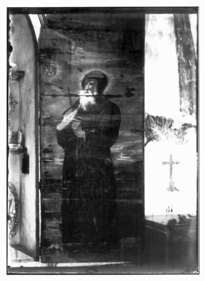 Para la realización de los santos que decoran el interior de las puertas es posible que el artista se inspirara en las convencionales estampas grabadas, aunque se advierte igualmente la potencia del volumen que protagoniza la escena principal, pintada en el exterior del armario. (Más información sobre el armario-relicario en Venida de la Virgen del Pilar a Zaragoza).
