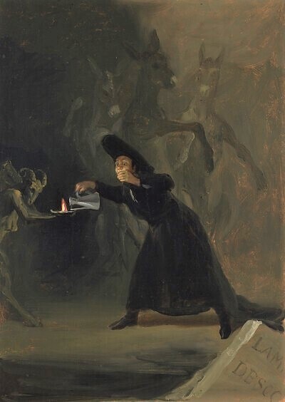 Goya realizó entre los años 1797 y 1798 una serie de seis pequeños lienzos sobre el mundo de la brujería y lo sobrenatural para los duques de Osuna. Éstos estaban decorando en aquellos momentos su nueva casa de campo en La Alameda, conocida como El Capricho. Se conserva una minuta presentada por Goya al duque fechada el 27 de junio de 1798 en la que se lee: "Cuenta de seis cuadros de composición de asuntos de Brujas, que están en la Alameda, seis mil reales de vellón".