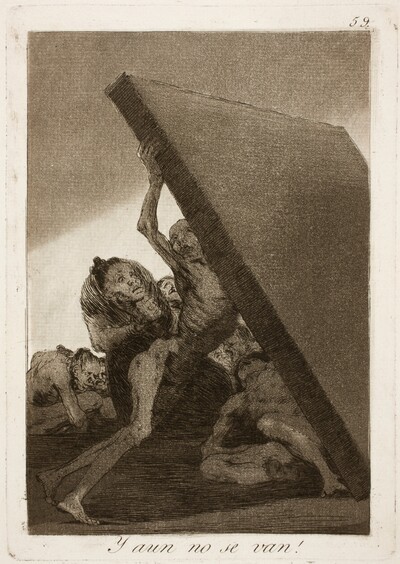 Dibujo preparatorio del Capricho 59. ¡Y aún no se van! El dibujo, realizado con líneas de sanguina, no contiene más que el bosquejo de la pesadilla, en el que consigue reflejar la tensión entre el peso de la piedra y la fuerza del espectro que trata de impedir que los aplaste. Pero es la aguatinta, y con ella el juego de las luces y las sombras, lo que creará verdaderamente este “horror de lo vago y de lo infinito” en la estampa final.