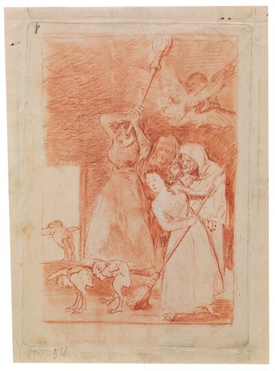 Goya coloca en primer término a dos jóvenes, la primera con una escoba diagonalmente dispuesta, mientras que la segunda la sujeta sobre su cabeza con las dos manos, tal y como más tarde hará en el grabado. Bosqueja en segundo término a los dos ancianos que asisten a la escena, aunque junto a ellos coloca también a un niño que mira divertido y que no aparecerá en la estampa. Además en el dibujo existe un fondo que no se constata en el grabado en el que se distingue una reja sobre la que se recortan aves en vuelo.