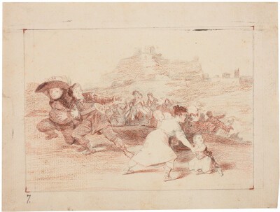 En un descampado a las afueras de una ciudad o de un pueblo que se puede ver al fondo, sobre unas colinas, varios personajes huyen despavoridos a la luz del día. Son personajes de toda índole, tanto laicos como religiosos que, en algunos casos, han tenido tiempo de recoger sus cosas. En la parte izquierda del grabado podemos ver a un clérigo con sombrero de teja que se aferra con las dos manos a una bolsa, al tiempo que huye con una expresión de terror en su cara. Junto a él un hombre le señala hacia atrás, posiblemente ha visto una situación que requiere ayuda, ante lo que el sacerdote parece hacer oídos sordos y le agarra por el brazo obligándole a continuar en la carrera. En el centro, en primer plano, Goya ha representado a una mujer que coge el brazo de un niño que mira hacia atrás y parece resistirse a abandonar el lugar en el que vive. La figura femenina lleva en su otro brazo un niño algo más pequeño. En el fondo ha grabado un grupo de personajes que corren, alguno de ellos a caballo.