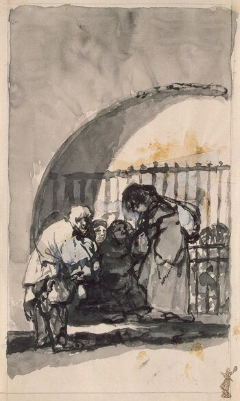 Mendigos ante una verja que cierra un arco