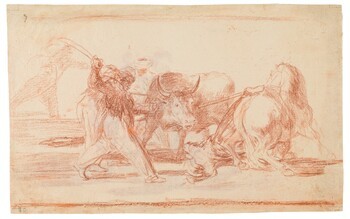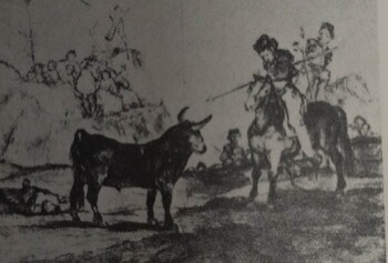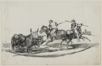 Modo como los antiguos españoles cazaban los toros a caballo en el campo (dibujo preparatorio)