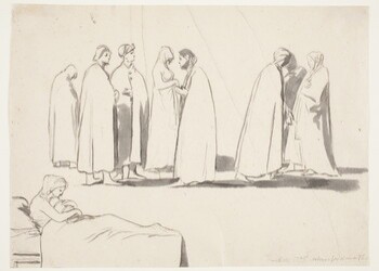 Tres grupos de figuras y entre ellos una madre en el lecho con su hijo