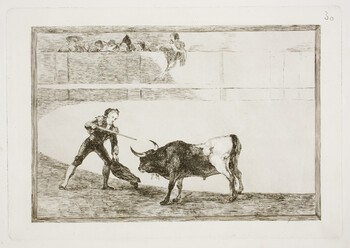Un diestro entrando a matar con un sombrero en la mano en lugar de una muleta (Tauromaquia I)