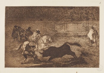 Un caballero en plaza quebrando un rejoncillo con ayuda de un chulo (Tauromaquia A) (dibujo preparatorio)