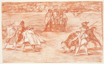 Varilarguero a hombros de un chulo, picando a un toro (Tauromaquia D) (dibujo preparatorio)
